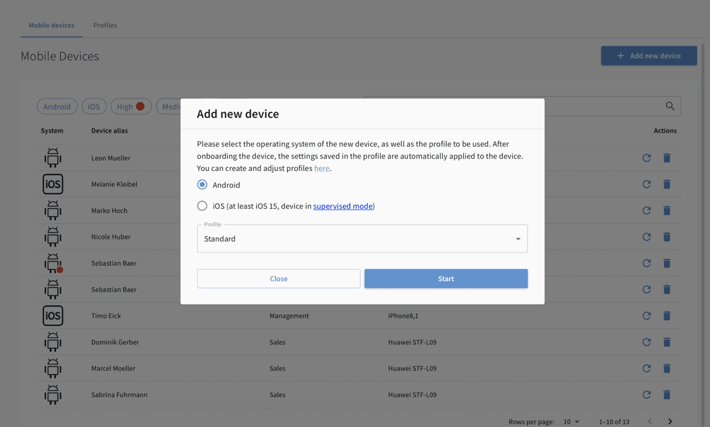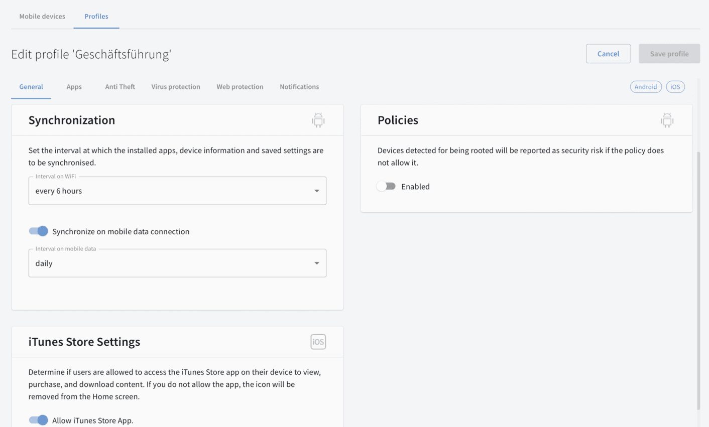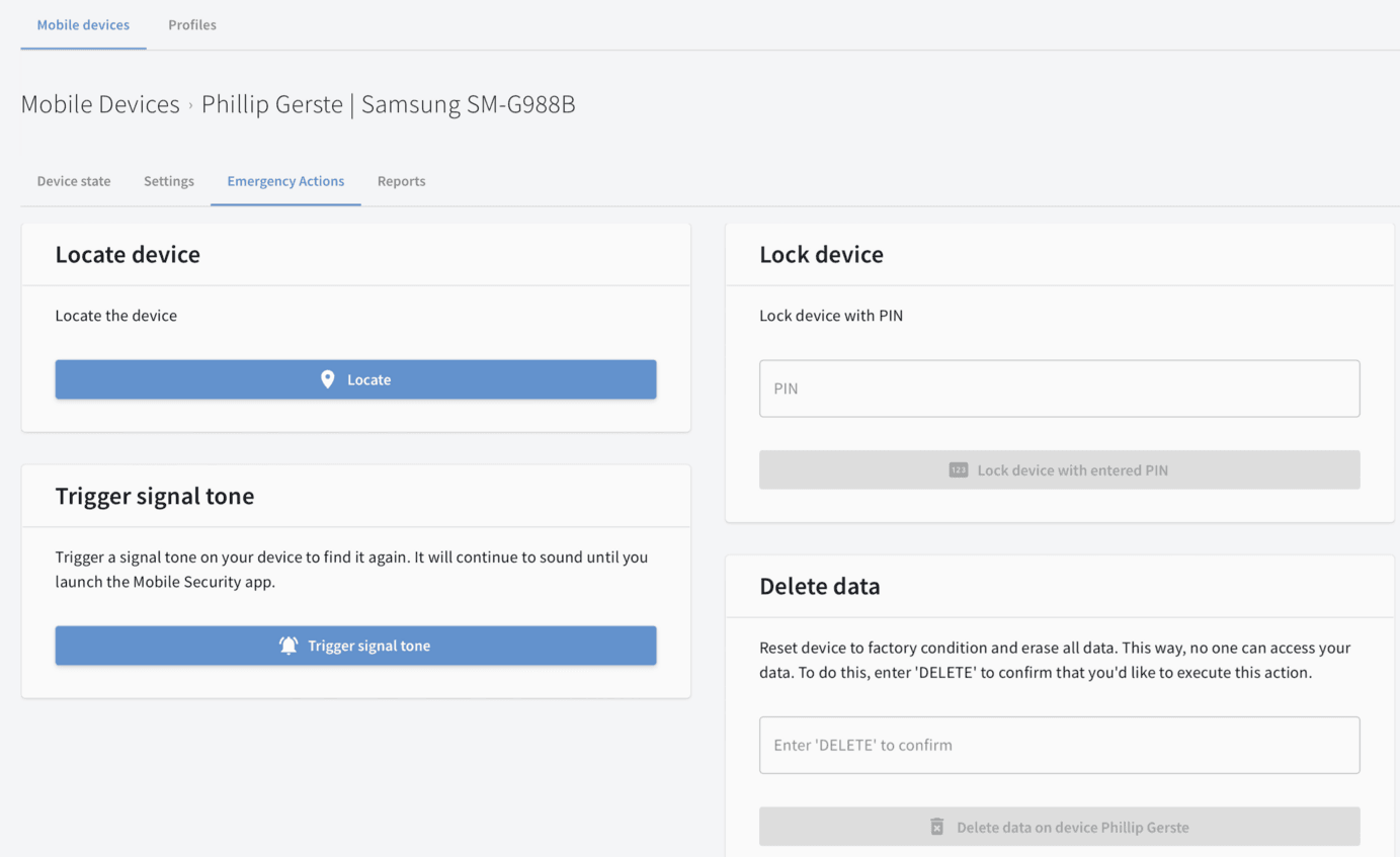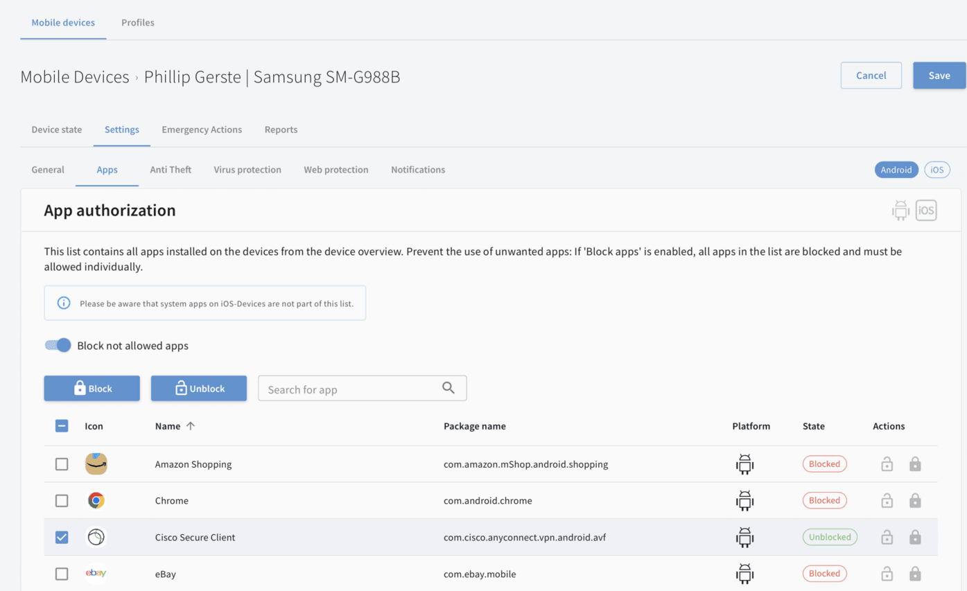 Cu soluția noastră MDM, gestionați centralizat securitatea dispozitivelor mobile iOS și Android, în conformitate cu liniile directoare actuale de protecție a datelor. Datorită conectivității în cloud, dispozitivele primesc întotdeauna cele mai recente actualizări de protecție, chiar și în afara rețelei companiei.