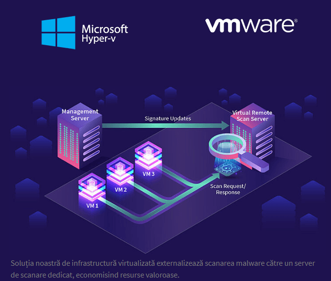 Eliberați memoria și procesoarele din mașinile virtuale cu soluția noastră. Agenții Light din fiecare VM externalizează întreaga scanare a malware-ului, păstrându-vă resursele cu securitate maximă pentru sistemele dvs.